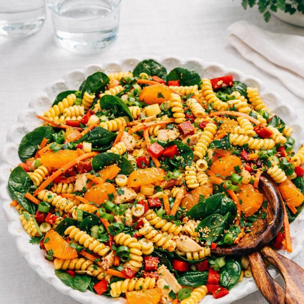 Step 4: Bring the Garden to the Bowl Once the pasta is fully chilled, it’s time for the fun part. Add the chopped spinach, shredded chicken, red bell pepper, drained mandarin oranges, carrots, green onions, and cilantro to the bowl. Gently toss everything together using large spoons or clean hands. You want to be careful not to break up the delicate mandarin segments—they are like little buried treasures in the salad!