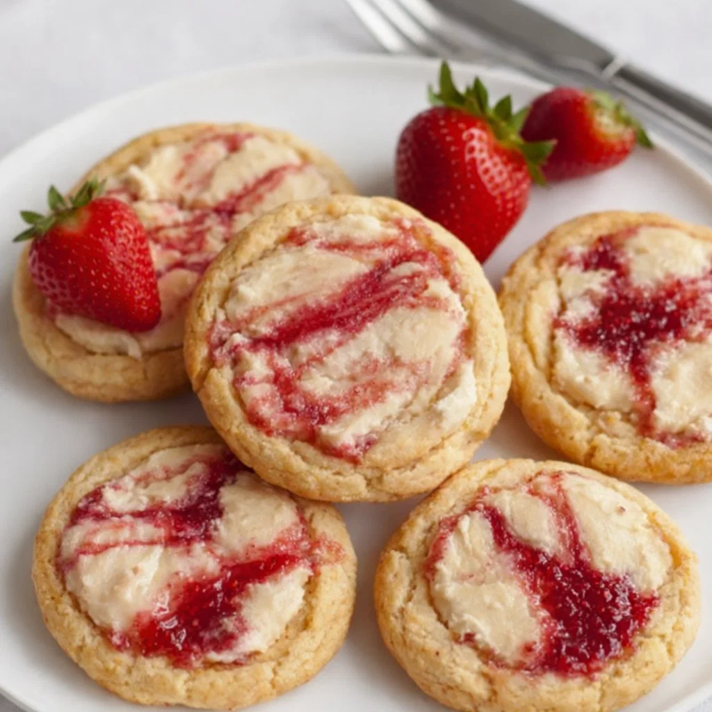 Soft and chewy strawberry cheesecake cookies filled with a creamy vanilla cheesecake center and swirls of homemade strawberry jam. These buttery cookies taste just like strawberry cheesecake in cookie form.